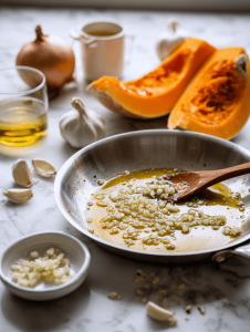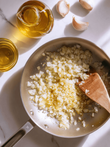 - Heat olive oil in a skillet over medium heat. Add the finely chopped garlic and sauté until fragrant, about 30 seconds, filling your kitchen with a savory aroma and the garlic turning a light golden.